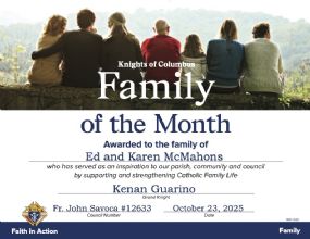 Joel & Amanda Studer & Children - Our Knights of Columbus Council at St. Thomas the Apostle would like to honor you and your family for the support you give our Parish, especially in the Youth Ministry, Family Ministry, and our Faith Formation Ministry. They are vital and treasured. You and your family are a constant at St. Thomas offering support to many other Ministries as well. The Knights especially appreciate all you do for us and we wish to recognize those efforts. |