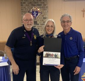 As far as awarding Family of The Month this should come at no surprise. It seems year after year and fundraiser after fundraiser this family has become as regular and consistent as one of the four seasons. Some people like to think that traditionally the end of summer is Labor Day weekend. I beg to differ and say it is a little more towards the middle of September. Not only do they put in a tireless effort all year to maintain places to raise funds physically, but increased our efforts tenfold by now having the fundraiser virtually as well. Then even as the event gets closer this family not only clears out their garage to help in the effort, but opens up the doors of their house. Maps and locations hang on walls that should have pictures of family or portraits to decorate the house. The kitchen table is open to knights who become accountants and bankers and seem to stay there for 48 hours straight. The table is not only the only thing, however. The rest of the kitchen is open as well as beverages and award winning chili is served by the gallon. They will always tell us that it is not just them but all the efforts of the council. However with their sacrifice it fullfills all duties of a knight. Charity, Fraternity and Unity. I award the family of the month award to the family of Joyce and Jim Manfre.