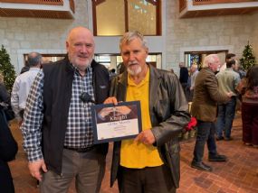 Elmer Pavalas was awarded the Knight of The Month for November for his countless hours that he spent making appointment, cleaning up, and making sure that the Knights and the Christian Men of Boerne had access to the old Kendall County Fair Grounds where we were able to fry 400 turkeys, and provide Thanksgiving meals for the those families less fortunate in Kendall County.