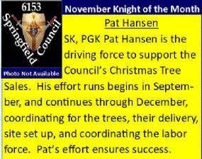 PGK, SK Don Howell is the epitome of a Knight of Columbus. He volunteers is Council and Assembly programs as well as other catholic and parish ministries. This month, he was the lead for the Coats for Kids, which was the most successful in recent memory, collecting over 200 coats and $520. He also actively supports the family food donations and is the Assembly Faithful Comptroller. |